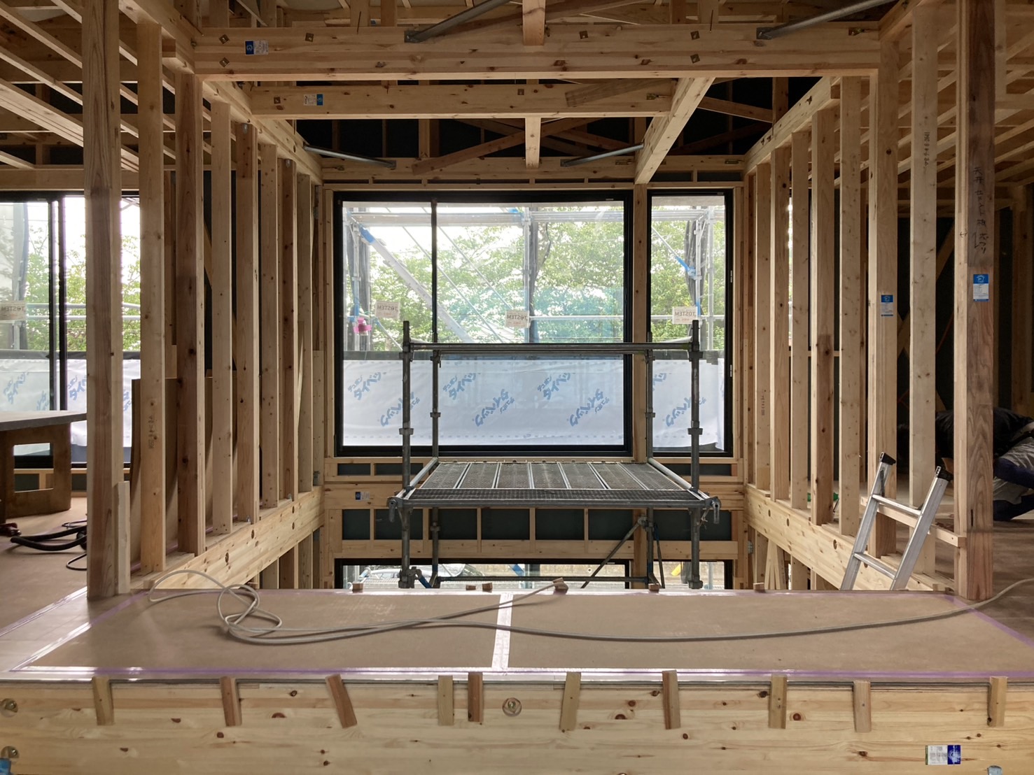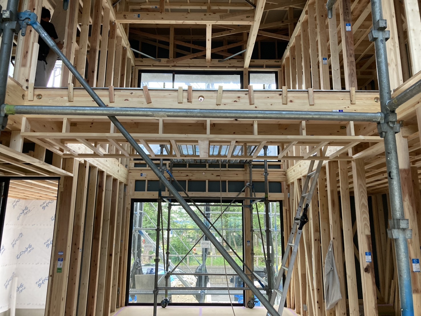 まだまだ足場もあり、構造体むき出しの状態なのでわかりづらいですが、大きな吹き抜けと渡り廊下がこの家の大きなポイントです。