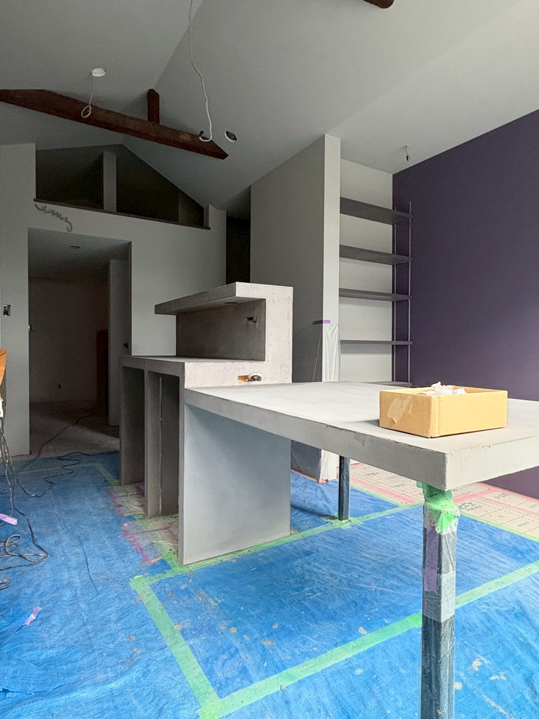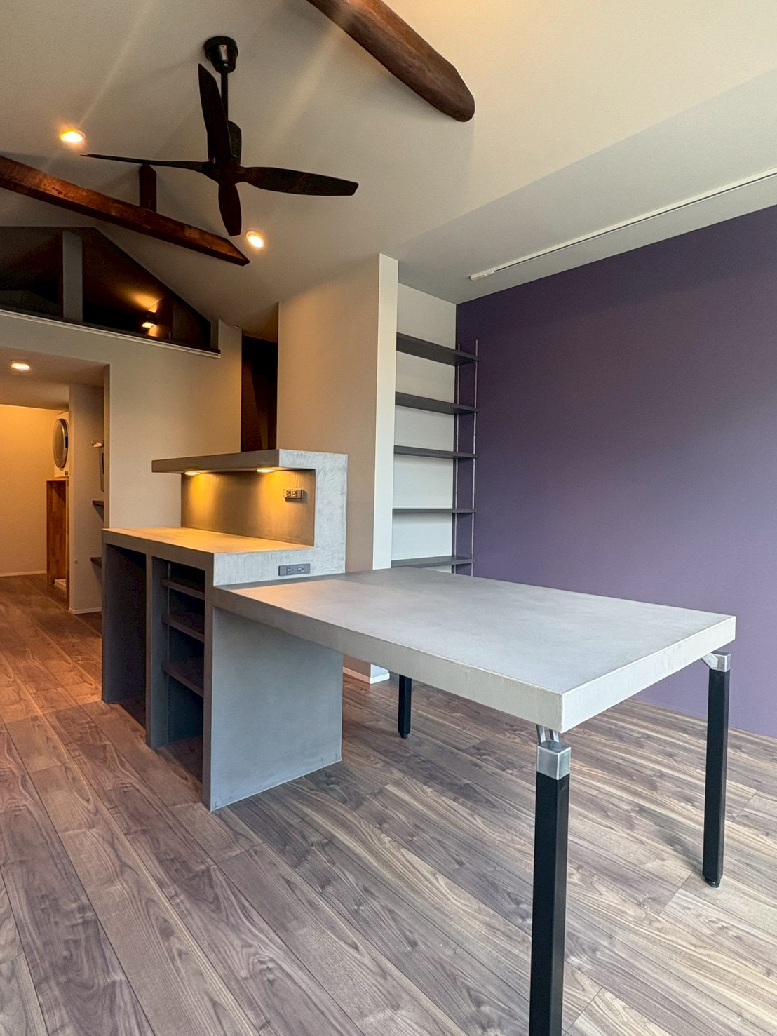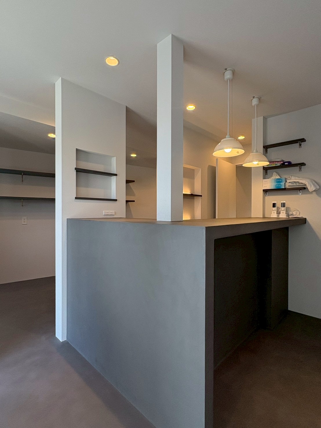 グレーのモールテックスで仕上げた床 + 一体型の造作カウンターと