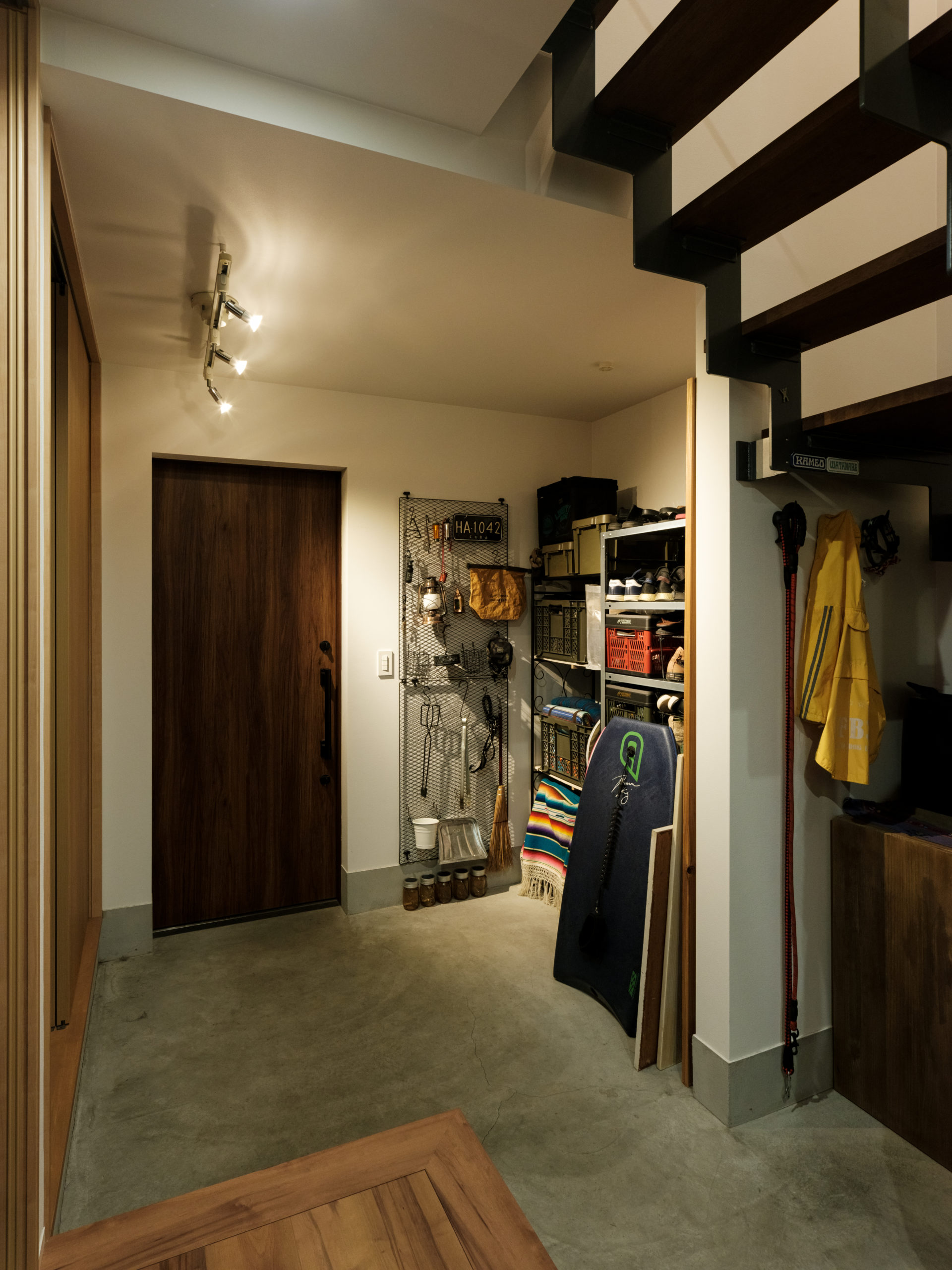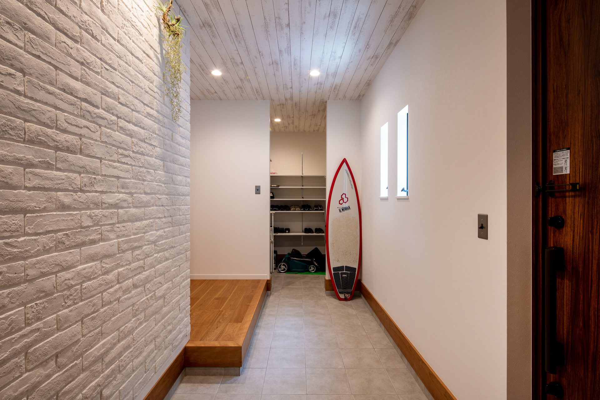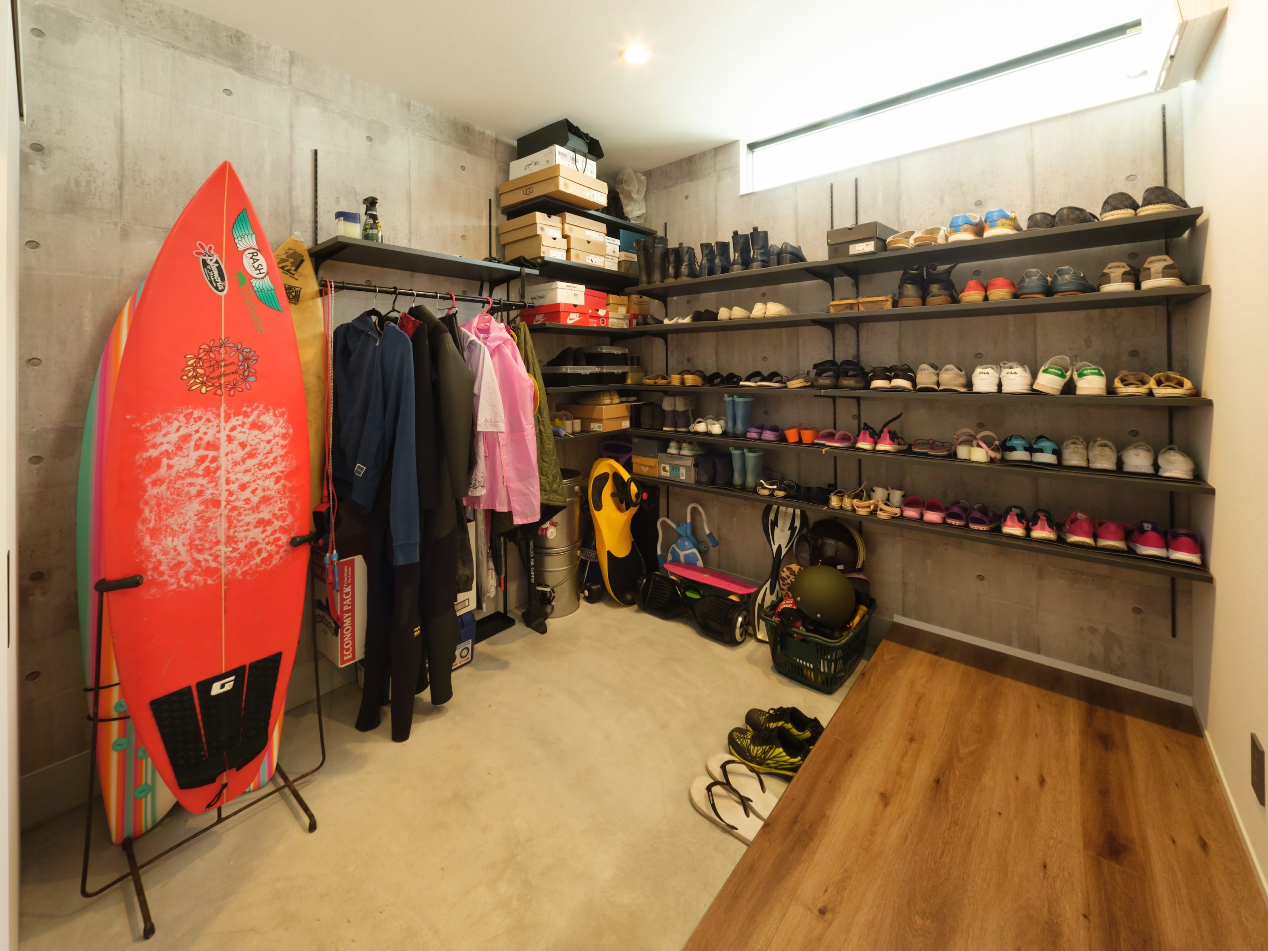 奥の棚は靴や日用品を整理するスペースにくわえ、大きなサーフボードも置ける広さを確保しました。