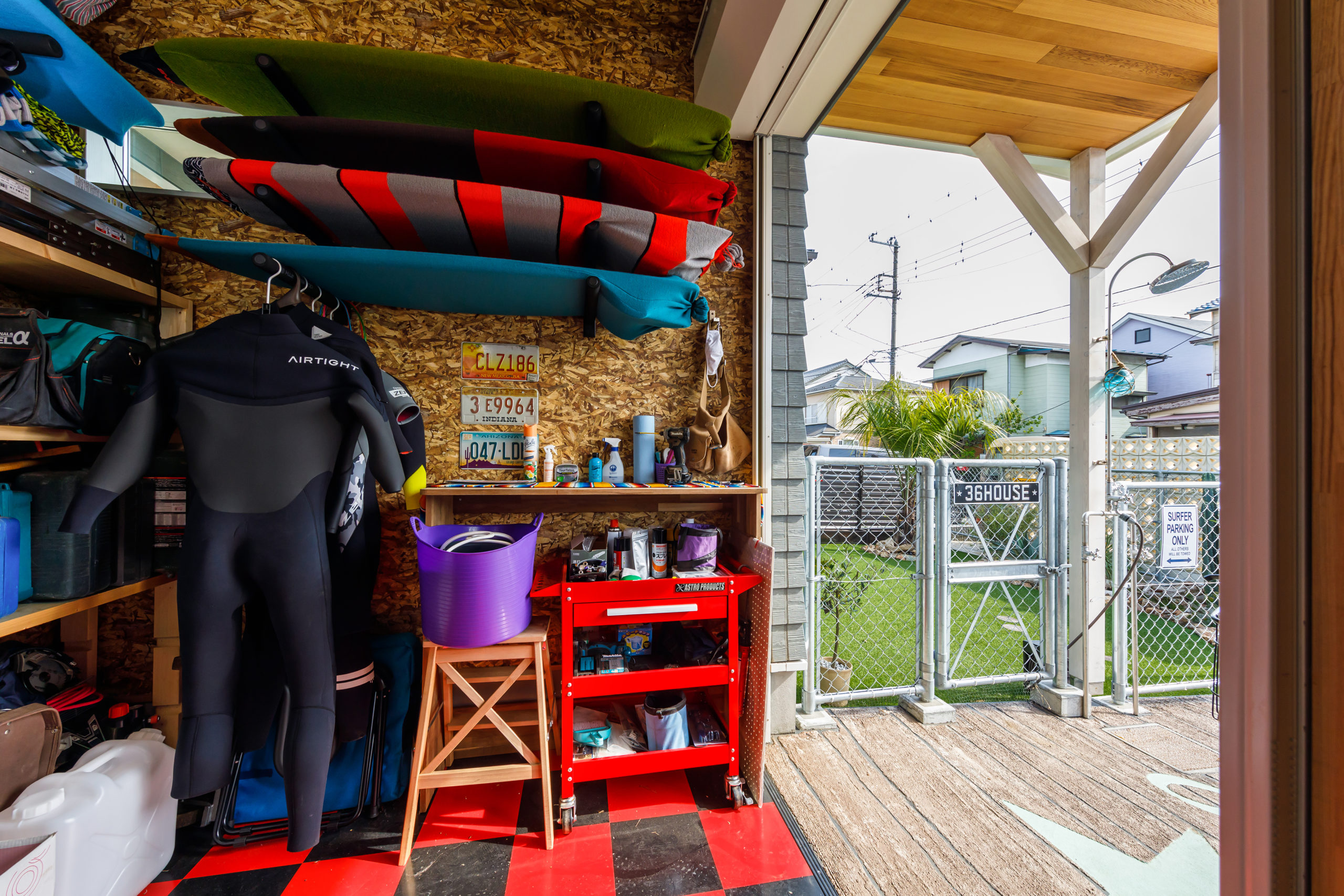 サーフボードやウェットスーツ、浮き輪や水遊び用のグッズなど、濡れたままでは室内に持ち込みづらいアイテムも一時的に置けます。