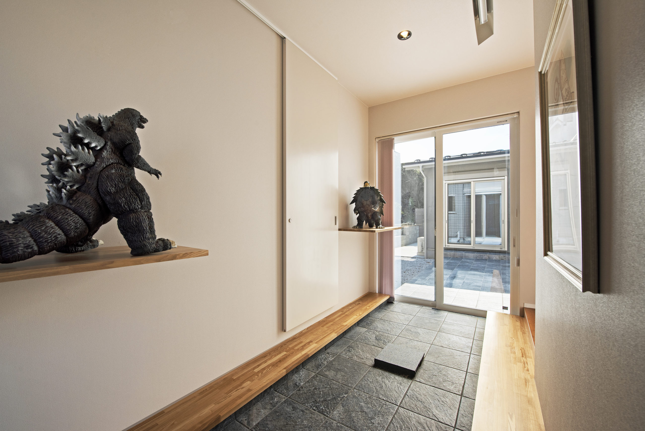 こちらは広々とした玄関土間に、趣味のフィギュアを飾れるディスプレイ棚を設けた施工事例です。