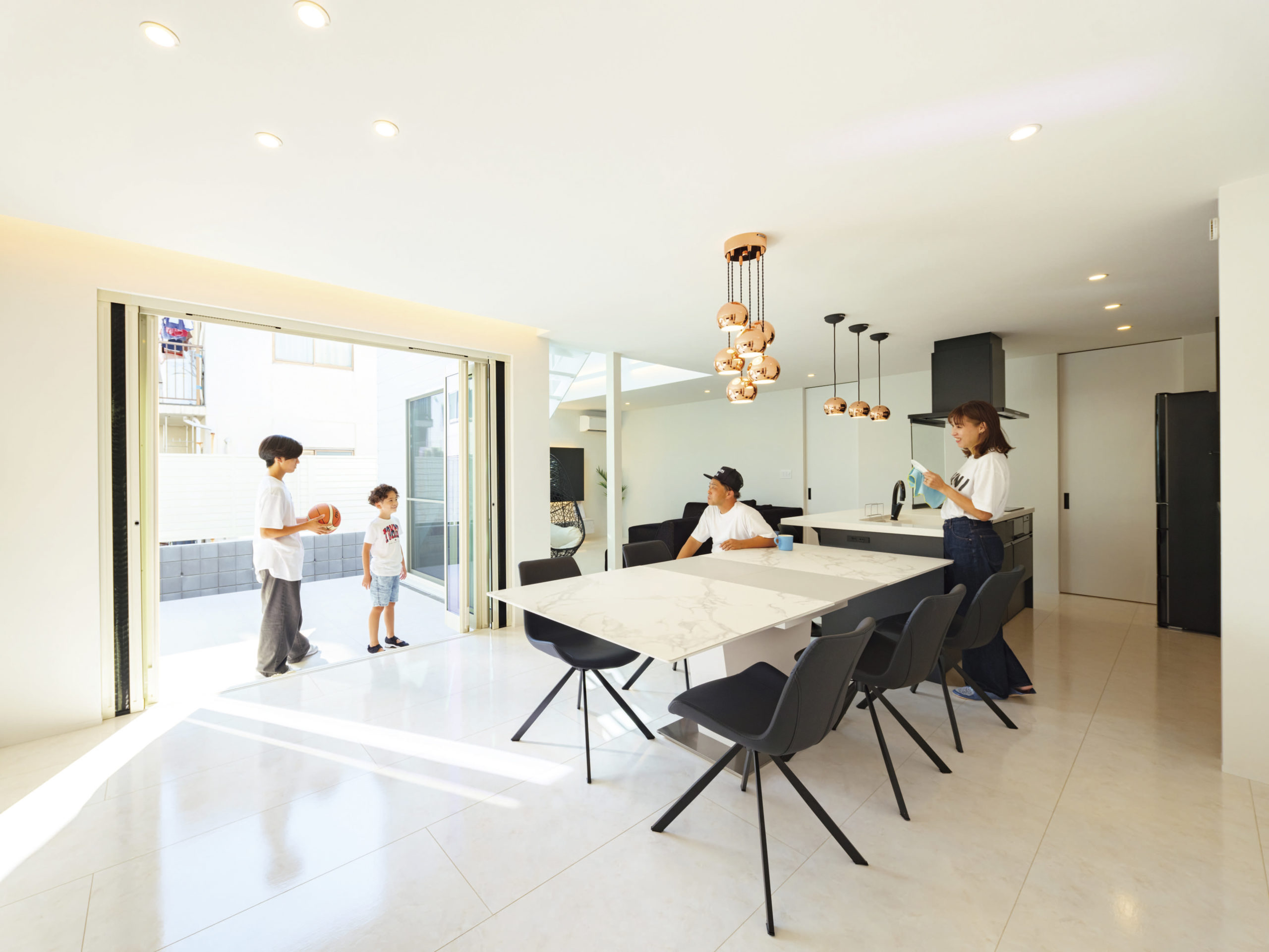 こちらのお住まいでは、キッチンの横に中庭を作りました。キッチンと中庭がすぐそばにあるため、家事の途中にふと視線を向けるだけで、外で遊ぶ家族の様子が伺えます。