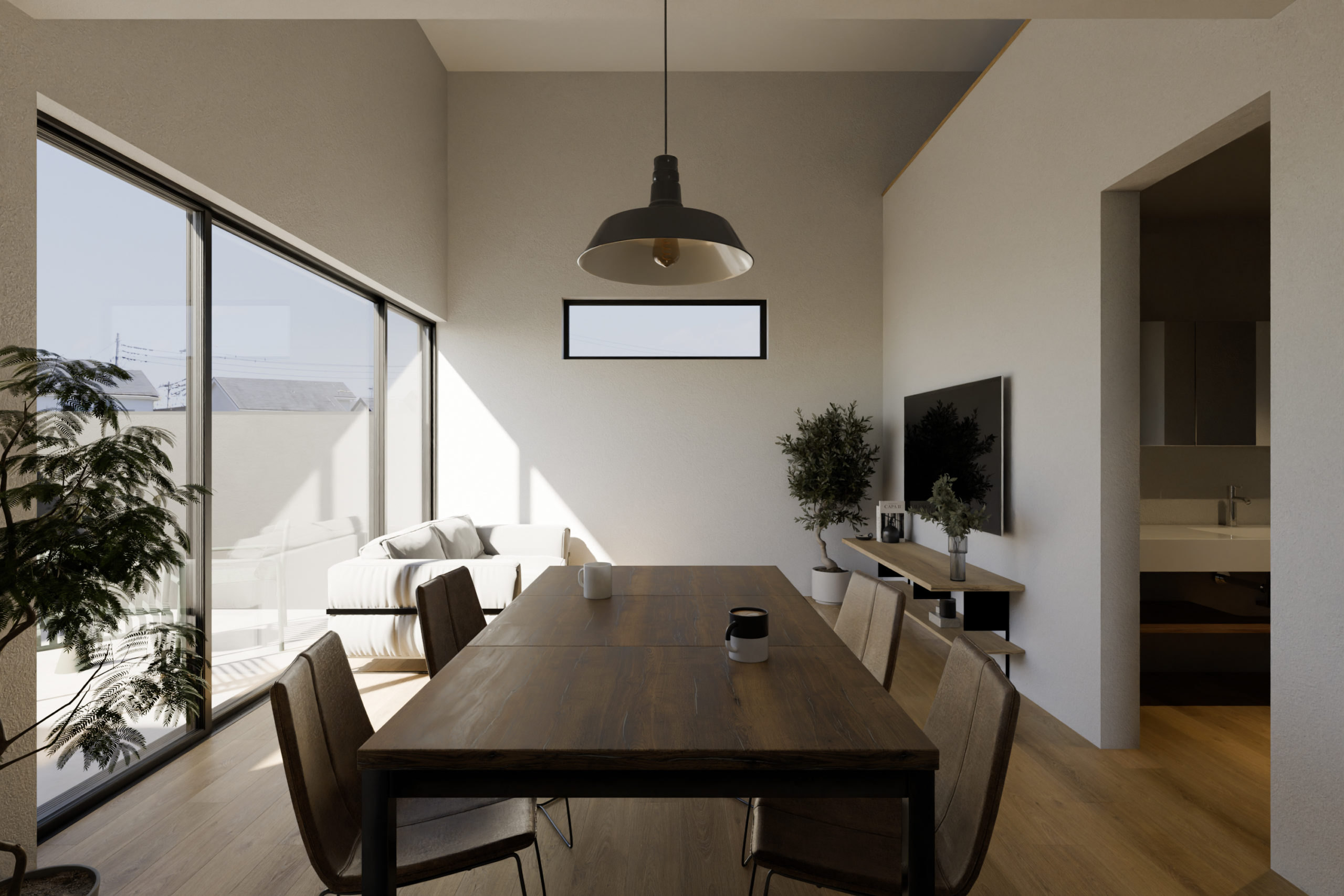 室内は大開口の窓から光が注ぐ開放的なダイニングを中心に、吹抜けやロフトが空間に広がりをもたらします。