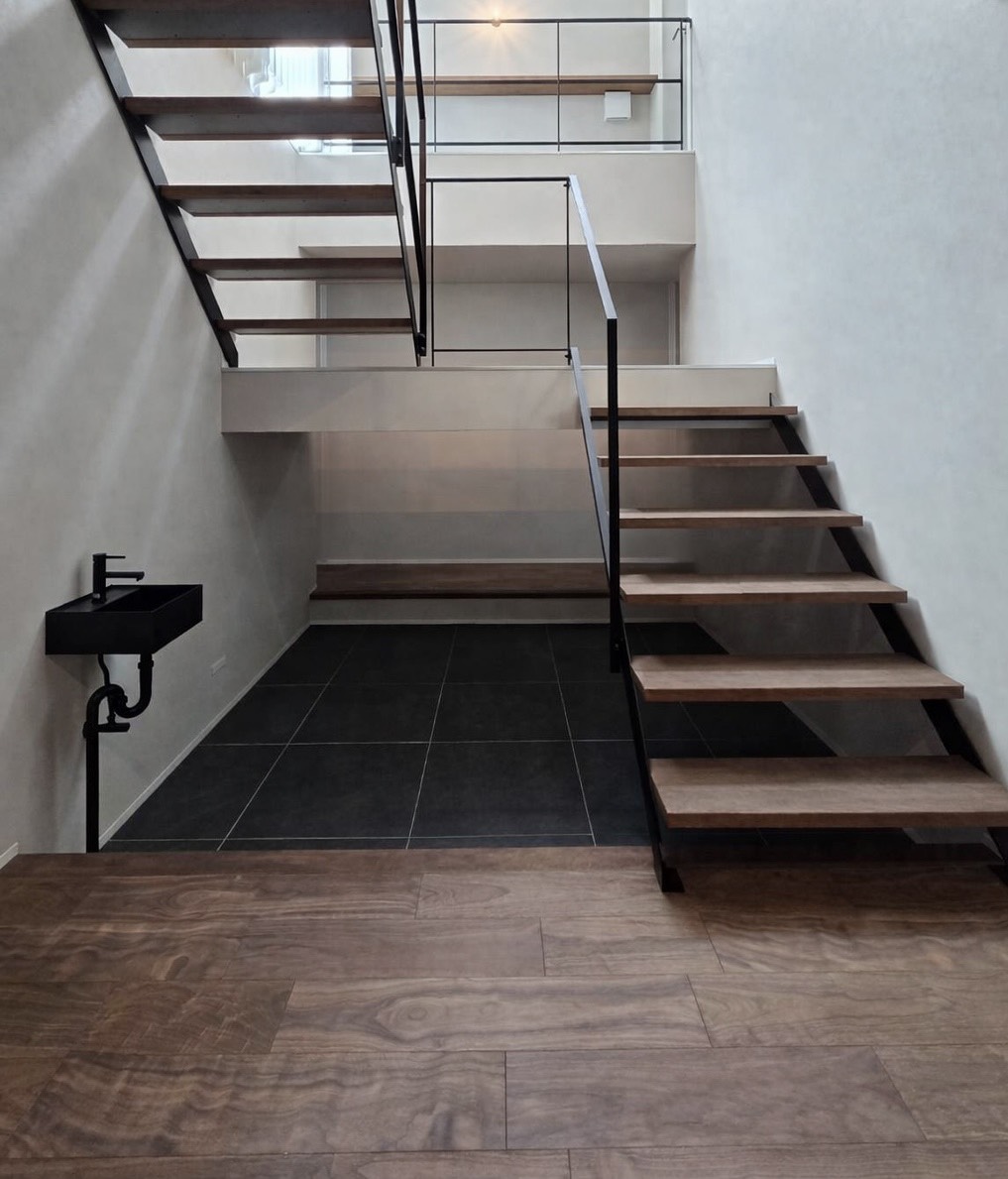 踊り場の下には小さなスケールの落ち着いた空間、踊り場に上ると様々な空間が目に入リます。