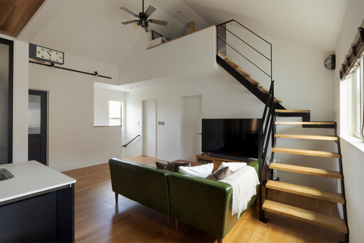 リビング上部には開放的な吹き抜けを設け、白を基調とした空間に、白に映えるモスグリーンのアクセントクロスで彩りを加えました。