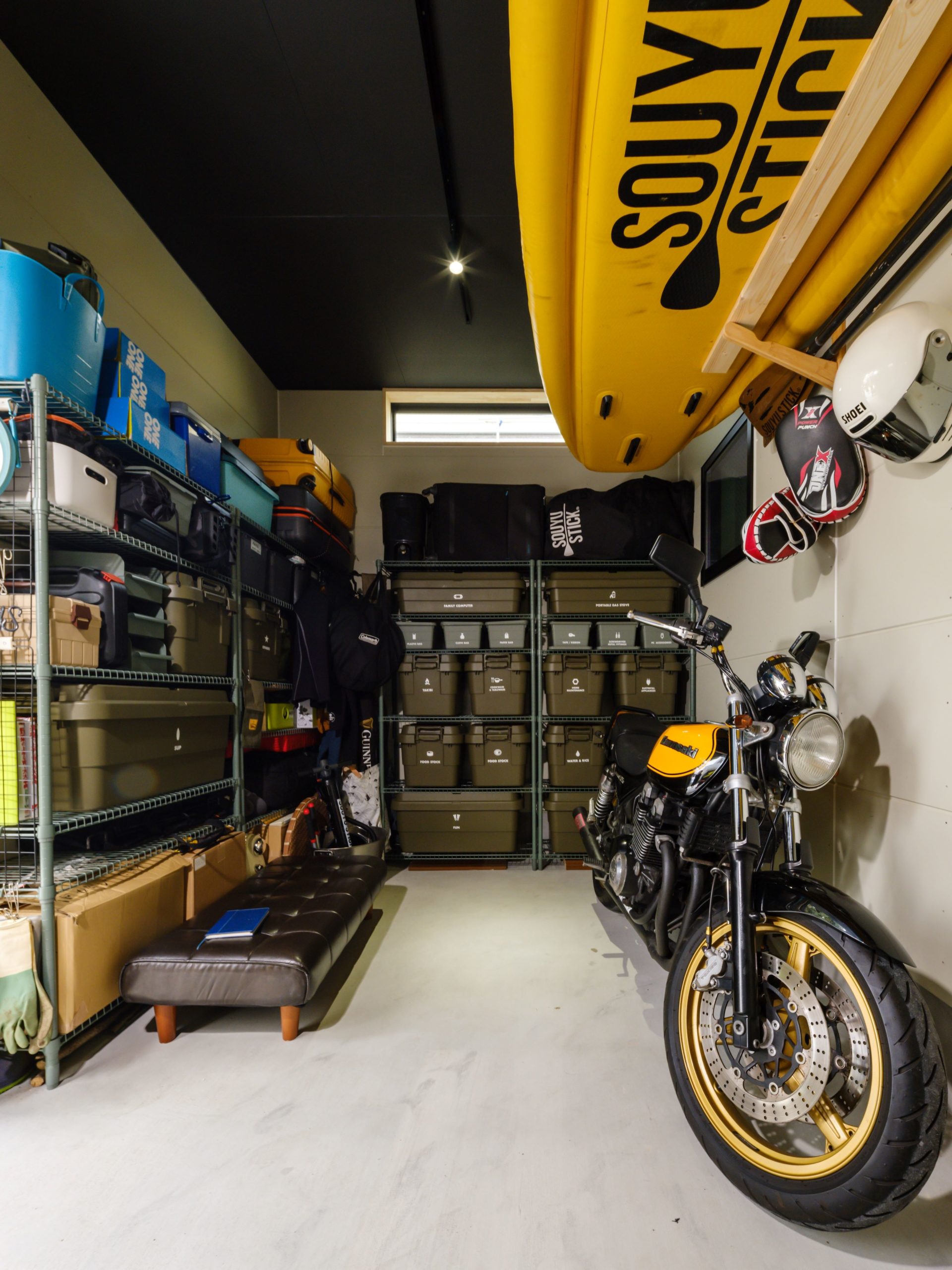 ガレージには愛用のバイクを置くことができ、趣味と共にある暮らしを思う存分楽しめます。