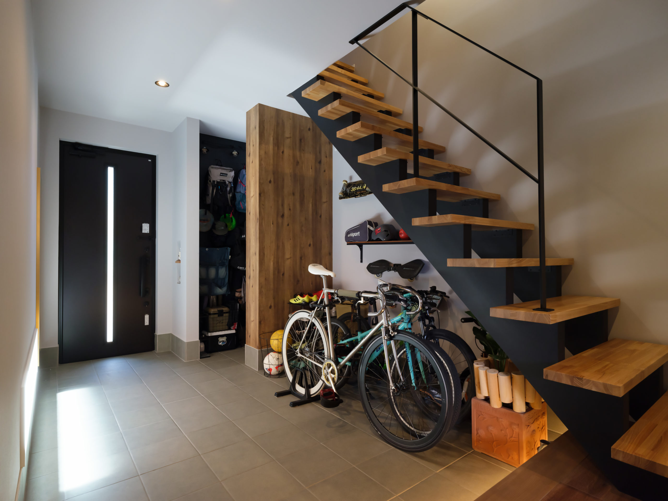 リビングから玄関土間、そして駐車場へとつながる空間は、バイクいじりなど、インドアとアウトドアをシームレスに楽しめます。