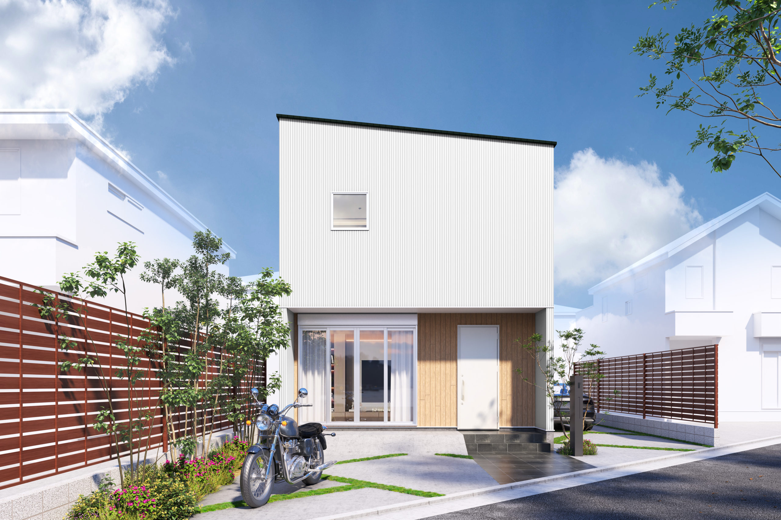 白の縦長のガルバリウムが印象的な、シンプルでコンパクトな二階建ての外観。