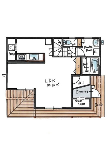 建物を囲むようにウッドデッキを配置し、リビングやキッチンからもウッドデッキで遊ぶお子様にも目が届きやすい間取りをご提案しました。