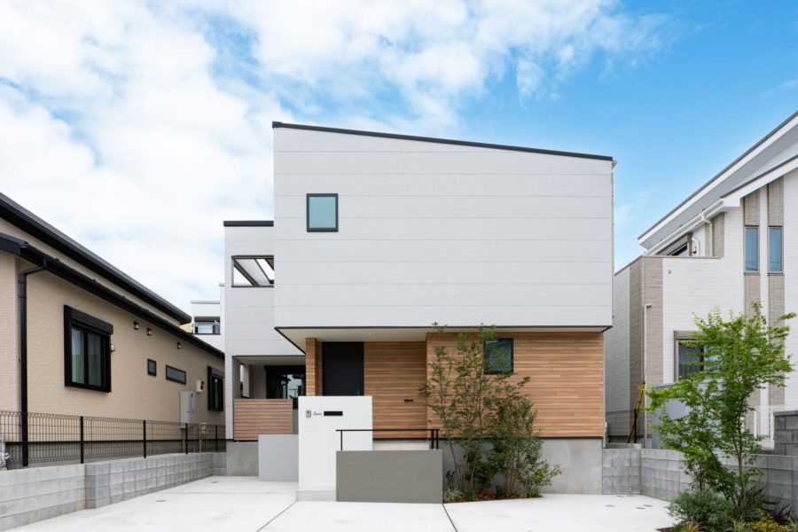 箱を組み合わせたようなデザイン+片流れ屋根のスタイリッシュな外観。少しグレーが入った白いサイディングと木目調の外壁を組み合わせることでぬくもりが感じられるデザインにしました。