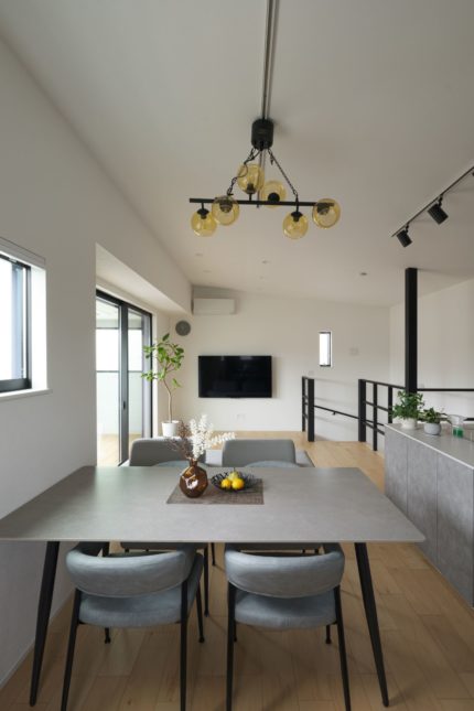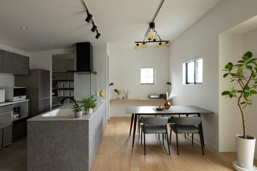 回遊できるキッチンを中心にした2階LDK。ご夫妻が希望したグレーをベースカラーにしました。