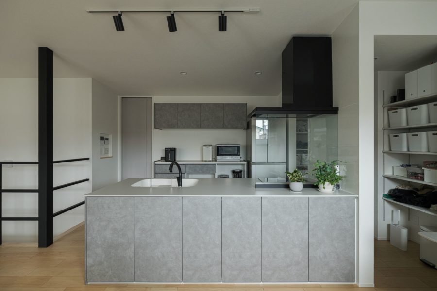 ペニンシュラ型の回遊できるキッチンが2階の中心。キッチンを中心にモノトーンでコーディネートしました。階段室の手すり壁や柱に採用した艶消しブラックが空間を美しく引き締めています。