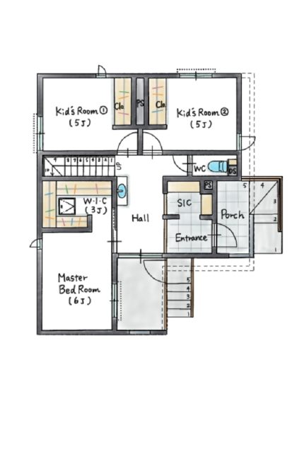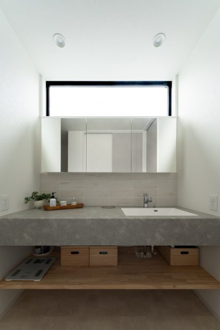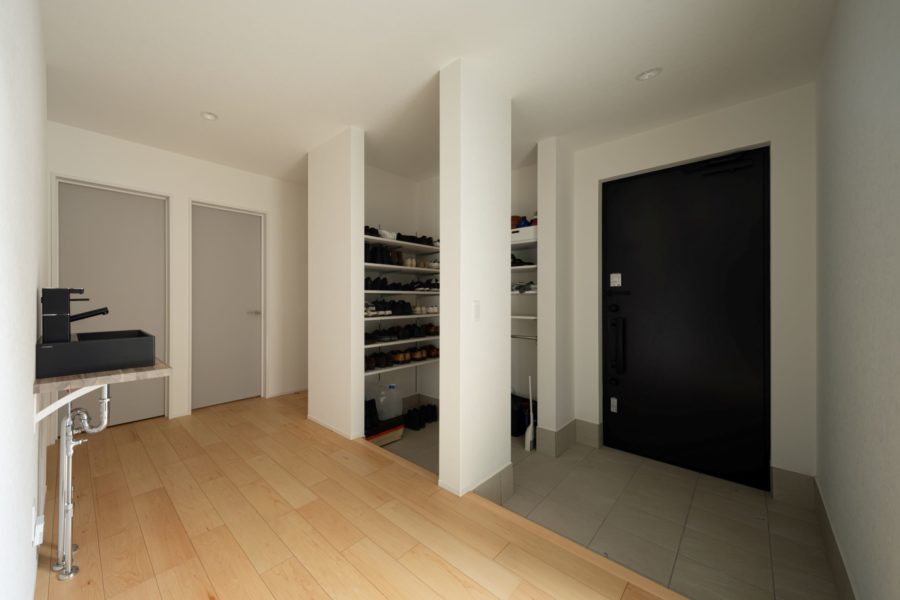 アウトドア用品やベビーカーも収納できる大容量のシューズインクローゼットをつくり、家族用と来客用の動線を分けた玄関。ウォークスルーのシューズインクローゼットの正面に、帰宅時の手洗いに便利な洗面台を造作しました。