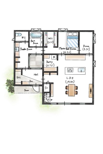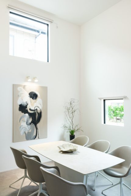 具体的な間取りの希望というよりも「玄関近くのトイレは避けたい」「洗面台の隣に洗濯機を置きたくない」「北側が暗くなるのはNG」など、細かな要望を箇条書きにして伺い、間取りに落としていきました。特にこだわったのが外観の魅力を引き立てる大きなデッキや、開放感を生み出す吹き抜けやハイドア、モダンな空間を印象付けるリビングの照明やダイニングテーブルなど。打ち合わせを重ね、まるで美術館のようなモダンな住まいが完成しました。