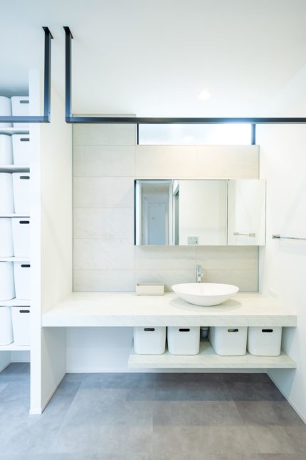 家の外観やLDKなどの雰囲気にぴったりあった、シンプルかつ洗練された洗面化粧台。