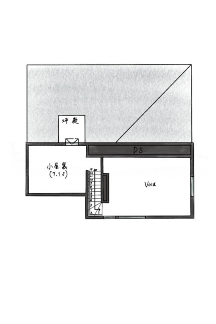 テレビ一体型の暖炉の背面に小屋裏への階段をつくり、7.1帖の収納スペースを設けています。