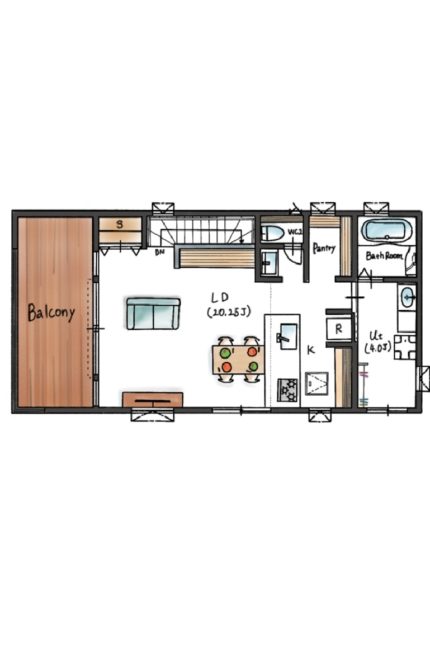 大開口や勾配天井の効果で、縦横に広がりが感じられるリビング。高窓の縁を薄くしたことに加え、バルコニー上部にも室内から続いているようにレッドシダーの木をあしらい、内外の一体感を高めています。カウンター左手の造作収納の下部はロボット掃除機の基地になっています。