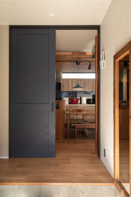 玄関を入って引き戸を開けるとLDKとつながる間取り。左側にはシューズインクローゼットを設置しました。