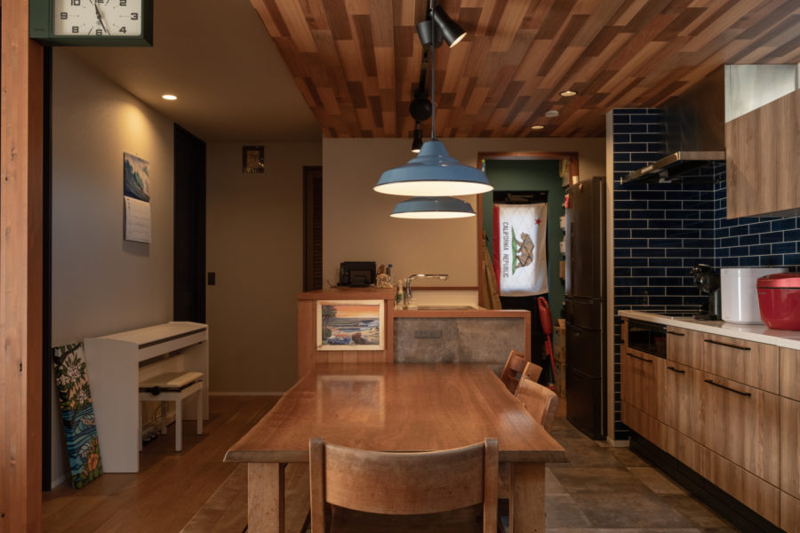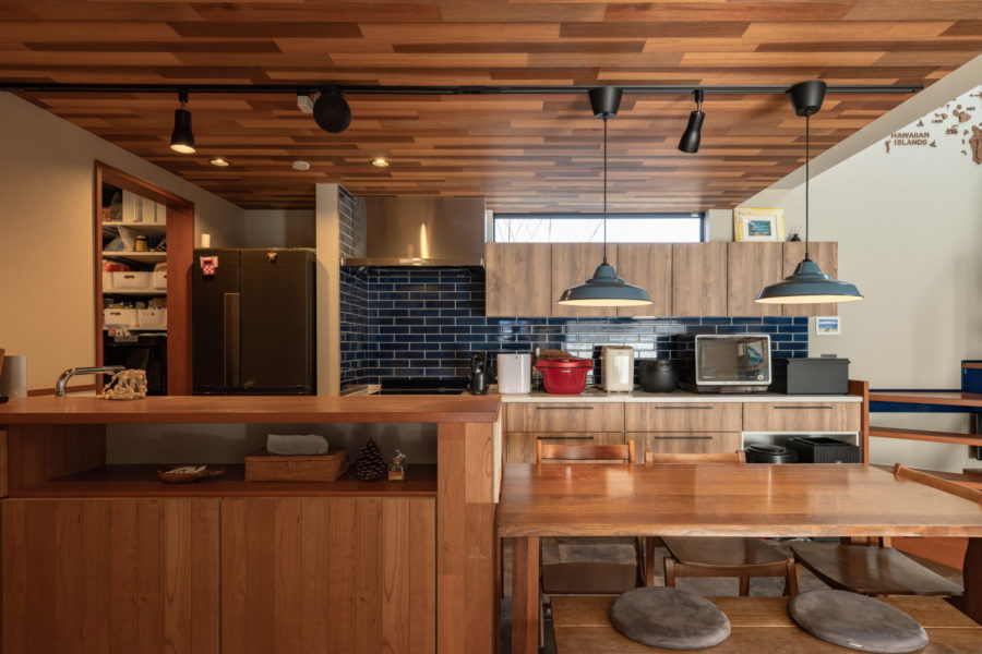 ダイニングテーブル上のペンダントライトやネイビーのタイルなどのご夫妻が吟味したアイテムと、木のぬくもりを感じる下がり天井などが美しく融合したダイニングキッチン。