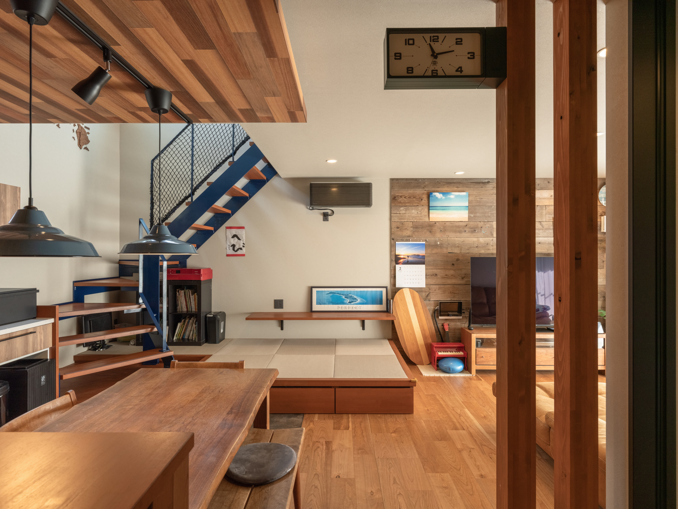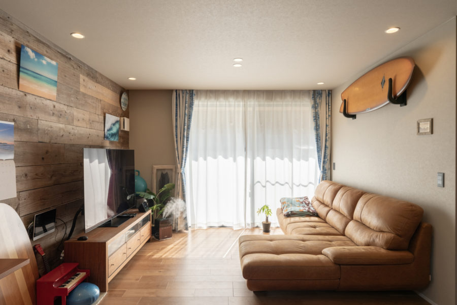 サーフボードがアクセントになった、ゆったりとくつろげるリビング。