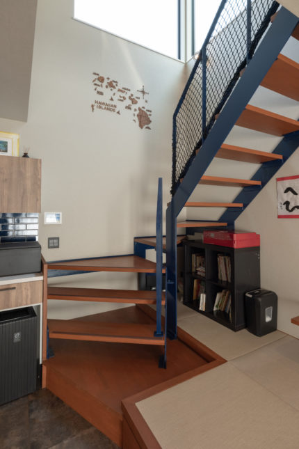 リビングの横に小上がりの畳スペースを設置。横になってくつろげるほか、カウンターを造り付けたことで学習スペースとしても使えます。