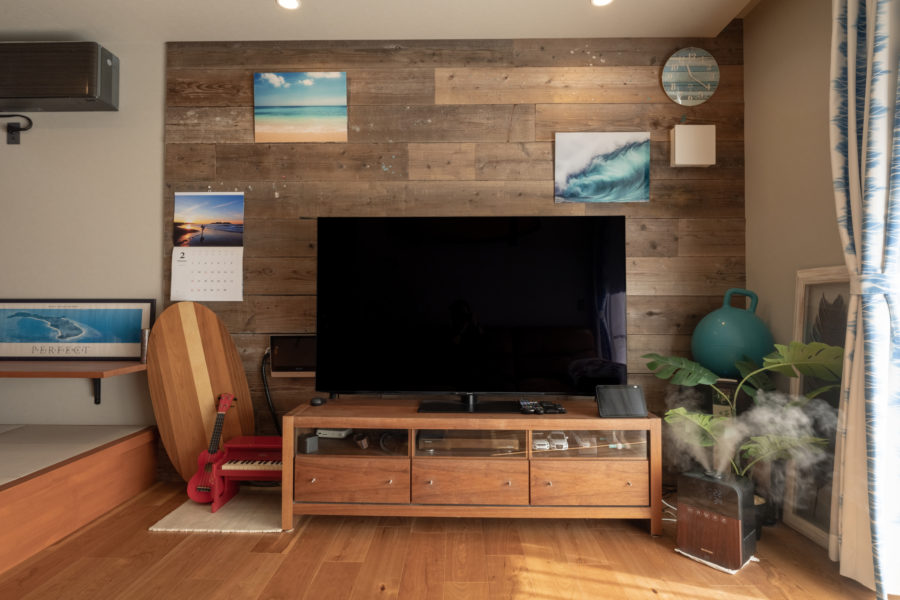 テレビ背面の壁には、キズさえも味わいになる丈夫な古材足場板を採用しました。