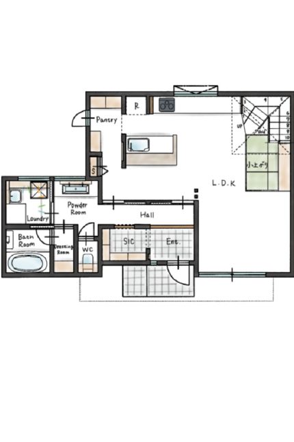小上がりの畳スペースを加えた広々としたLDK。玄関近くには帰宅時の手洗いにも便利な造作の洗面化粧台、ランドリールームには洗濯家事がラクにできるようにガス乾燥機を備え、家事ラクを実現しました。