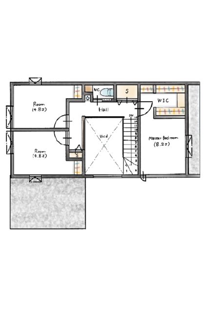 2階には大容量のウォークインクローゼットを備えた主寝室のほかに2つの子ども部屋を配置。トイレ後の手洗いや就寝前の歯磨きなどに便利な造作の洗面台を設置しました。