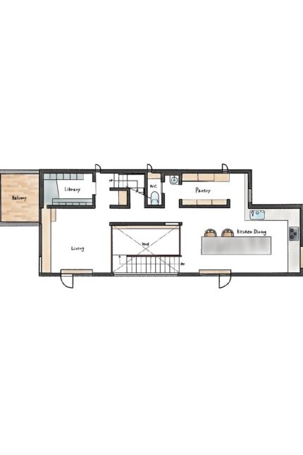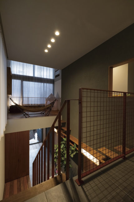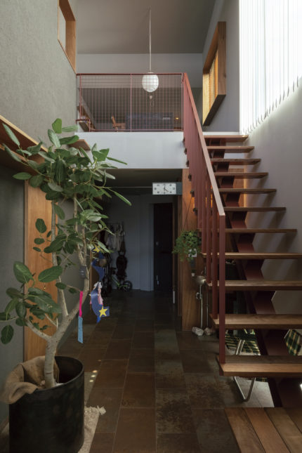 右側の壁の奥が廊下で、奥のリビングと行き来できるようになっています。階段まわりを吹き抜けにすることで、1階と2階でコミュニケーションが取りやすい間取りに。
