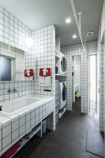 清潔感あふれる白いタイルを用いた1階の洗面脱衣室。