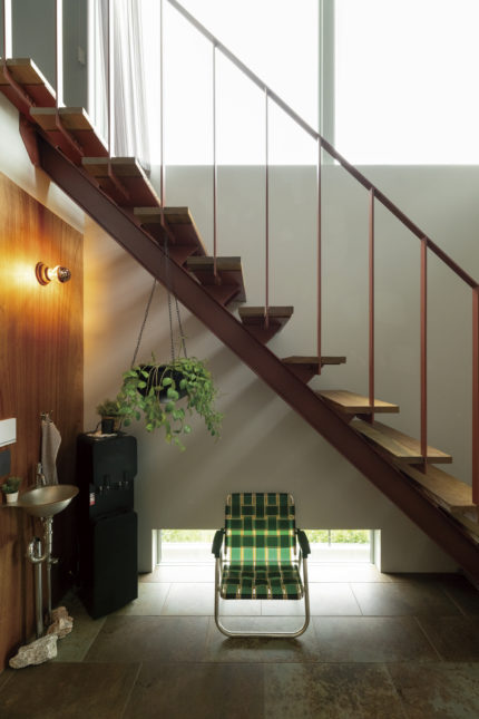 踏み板の厚さや面の見え方などにもこだわったスケルトン階段。スチールの手すりも最低限にし、軽やかさを演出しました。