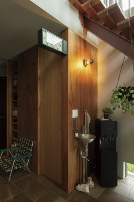 階段下にはトイレ後や帰宅時の手洗いに使える造作の洗面台を設置。ここに飾られた壁掛け時計や照明が、どこか懐かしいノスタルジックな雰囲気を醸し出し、心を和ませてくれます。