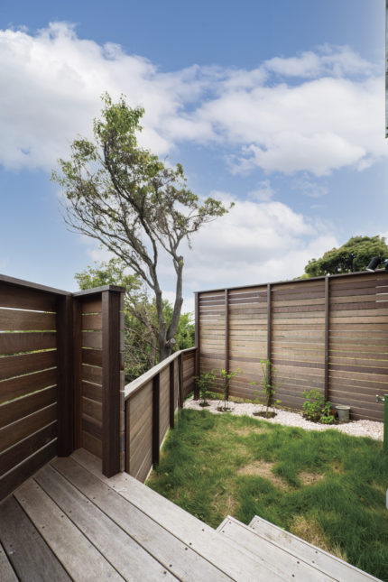 ウッドフェンスは、隣家からの視線を遮りプライベートな空間を守りつつ、眺望を楽しめる方角は低く設計することで、開放感も確保しています。