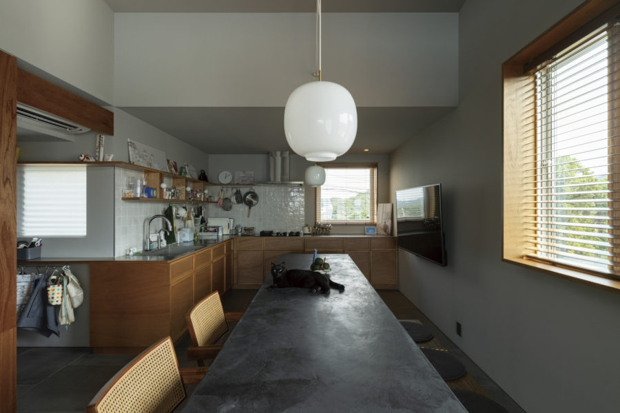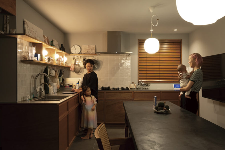 生活の中心となる場所として、広いスペースを確保したダイニングキッチン。ご夫妻こだわりのダイニングテーブルとL字型のキッチンは造作で、使い勝手も抜群。