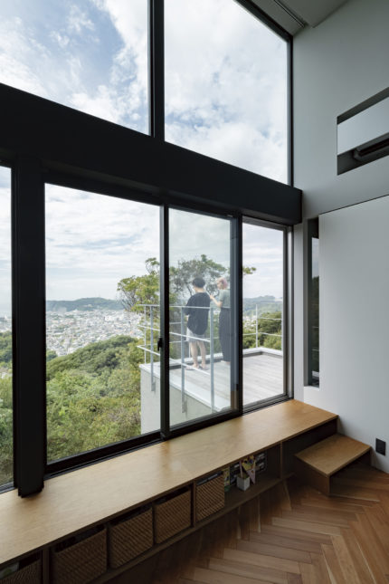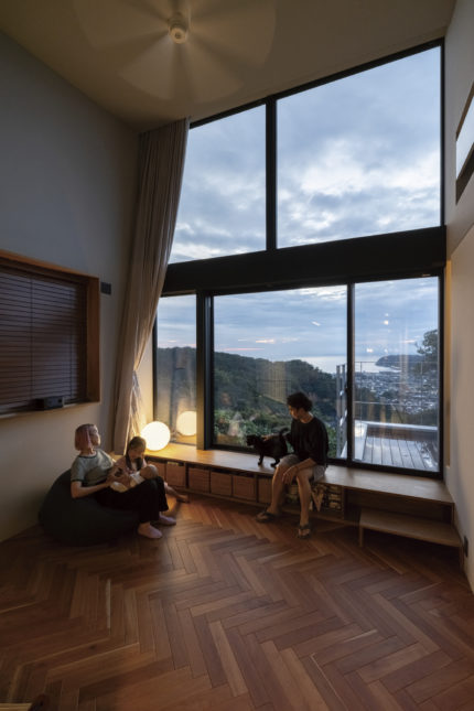 「この土地にはこの家しかない」。そう言いたくなるほど、海や富士山などが見えるロケーションを最大限に生かしたS氏邸。開放感に満ちたリビングでは、ベンチとしても使えるように設計した窓辺の収納に腰掛けて、移りゆく景色を心ゆくまで堪能できます。