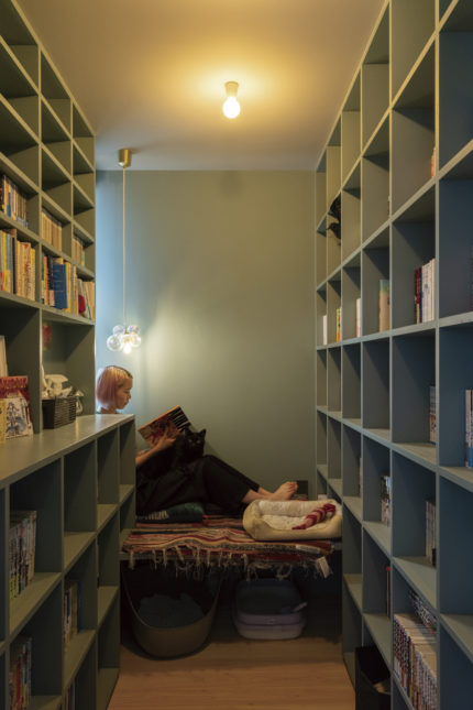 たくさんの本に囲まれたファミリーライブラリーは、本好きの夫人の夢を形にした心ゆくまで読書に没頭できる空間。