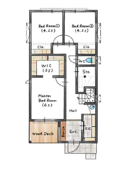 1階は、荷物置き場にも便利な大きなベンチやシューズインクローゼットを備えた玄関に加え、主寝室と2つの個室、階段下には書斎が設置されています。玄関横には主寝室から出入りできるウッドデッキをつくり、採光を確保しました。