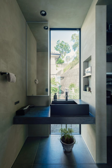 正面に壁ではなく窓を配置した、まるで浮いているかのような造作の洗面台。