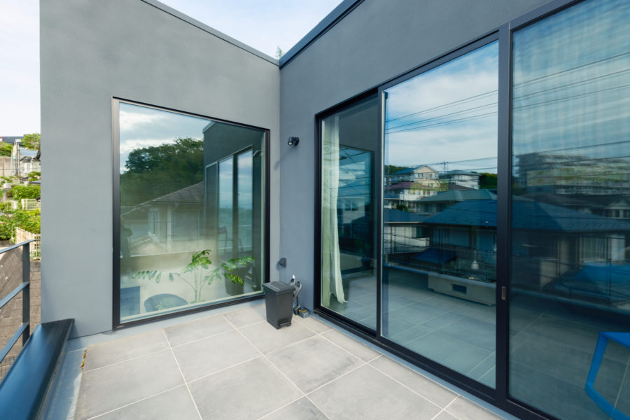 光と風を室内に導く、大開口でLDKとつながる2階のバルコニー。室内と同じタイルを用いることで、視覚的にも室内外の一体感を高めています。