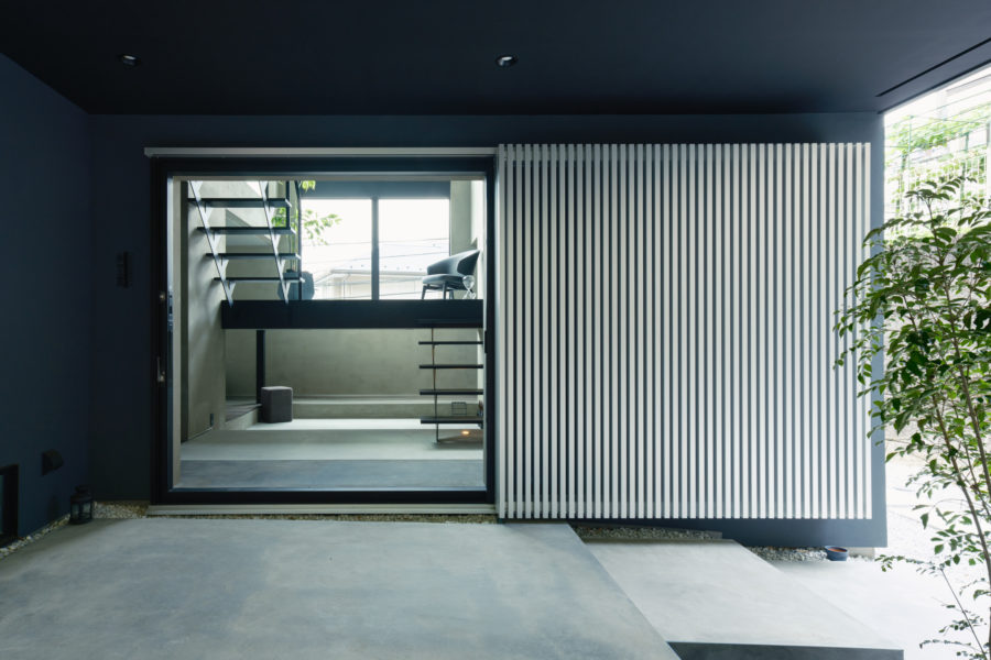 開放的な住まいを象徴する、まるで美術館のような佇まいの広々とした来客用の玄関。片引きの大開口サッシと一体となった縦格子も目隠し&アクセントに。
