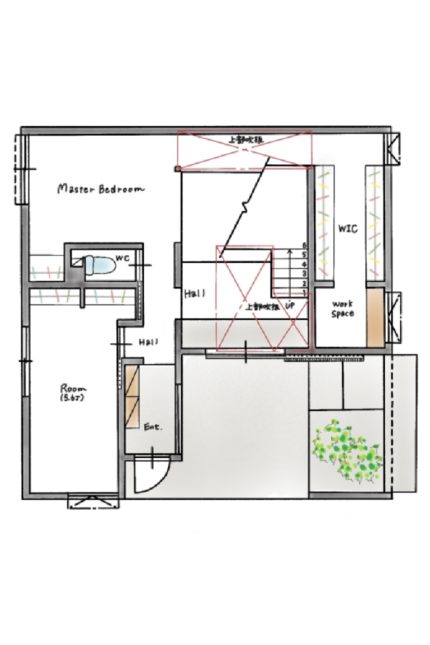 来客用玄関の正面にはステージのような大きな踊り場を設置。主寝室はあえて個室にせず、玄関や2階とひとつながりの空間に。