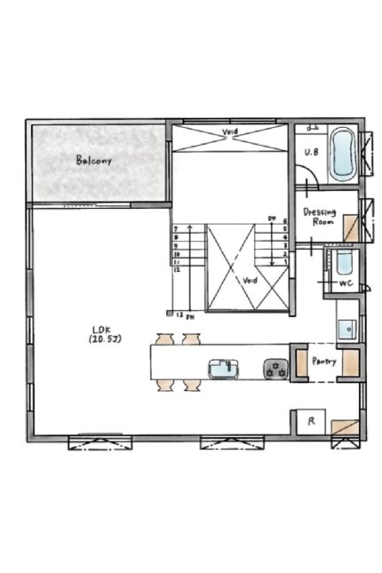 20.5帖の広々としたLDKを中心とした、間仕切りのほとんどない大空間を実現しました。