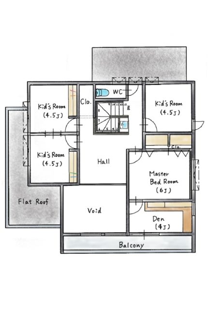 セカンドリビングとして使うホールのほかに、主寝室と子ども部屋を配置したプライベートフロア。ホールには今後プロジェクターを設置して映画などを楽しめるようにする予定です。