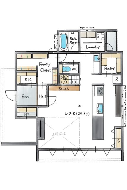 キャンプなどに出かける際も、シューズインクローゼットや外部収納などにしまってあるキャンプ道具をすぐに車に積むことができて便利です。