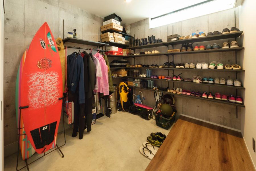 サーフィンやバーべキューなど趣味を楽しむ道具をたっぷりしまえるシューズインクローゼット。土間は外で使う道具も気軽に収納できるので便利です。