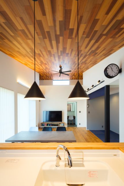 キッチンからリビング側を見た様子。奥に向かって天井が高くなる、抜群の開放感を味わえる家になっています。