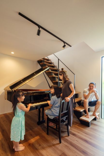 玄関ホールにはグランドピアノを設置。お洒落な鉄骨階段は腰掛けるのにもぴったりです。美しい音色が家中に響きわたる、豊かな暮らしが楽しめる家になりました。