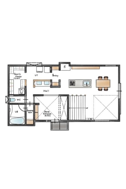 吹き抜けのある広々とした土間玄関から続く室内は、ほとんど間仕切りがない大空間になっています。いつでも家族の気配を感じられる家です。特徴的なのが、椅子のように腰掛けてくつろぐことができる幅広の大階段です。家族が自然と集まる居心地の良いスペースになっています。木のぬくもりに満ちた空間とマッチしているステンレスのキッチンは、お施主様のご希望を実現させたものです。焼杉をアクセントにした外観は、設計士とお施主様で何度もシミュレーションを重ねて完成させました。